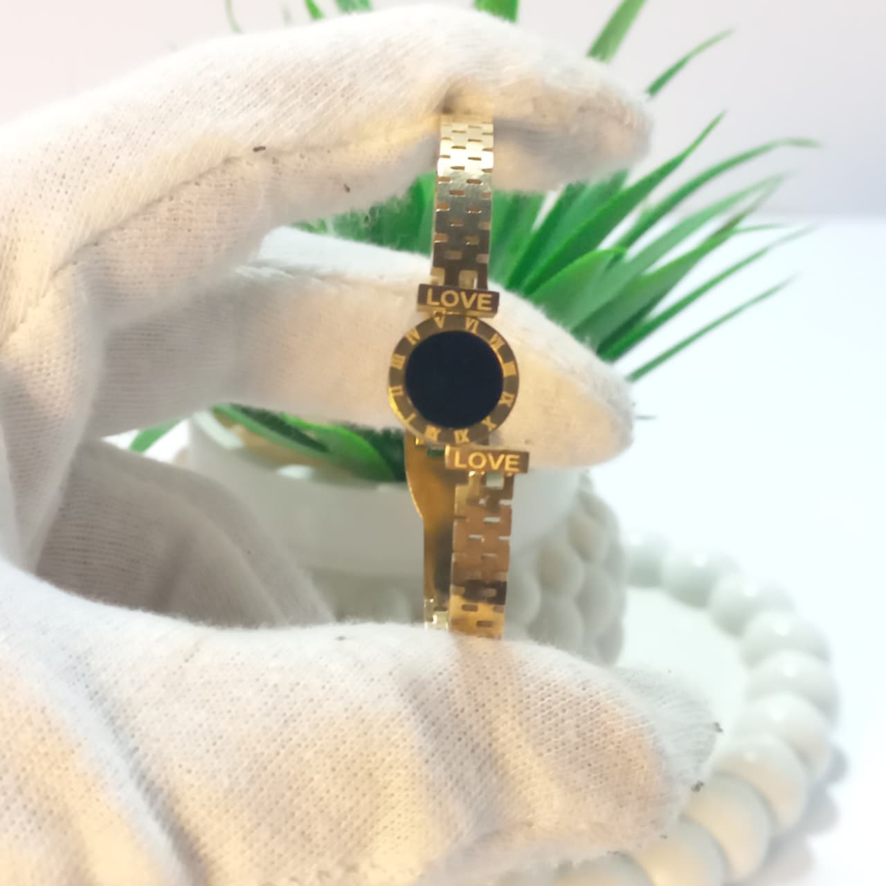 Add a touch of timeless elegance to your style with this beautifully crafted gold bracelet, showcased under soft luxury lighting that highlights its refined details. The sleek gold finish paired with a striking black round center creates a bold yet sophisticated contrast, reflecting modern luxury and minimal charm. The delicately engraved “LOVE” detail catches the light gracefully, adding emotional depth and premium appeal.