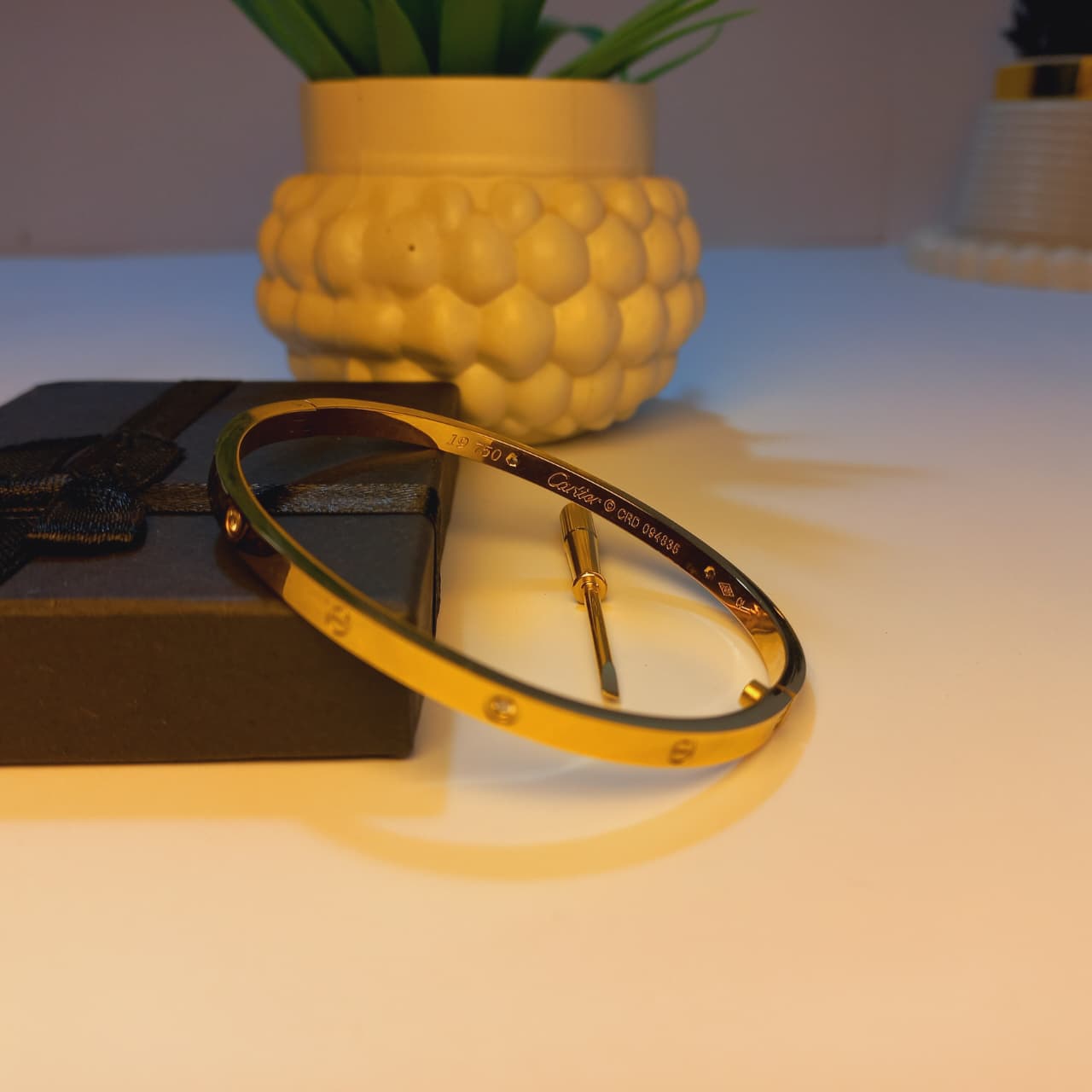Apni wrist ko aik royal aur timeless look dein! Yeh stunning Gold-Plated Love Bangle un logon ke liye perfect hai jo sophistication aur elegance ko pasand karte hain. Iska iconic screw-head design aur behtareen craftsmanship ise har moka ke liye behtareen banati hai.